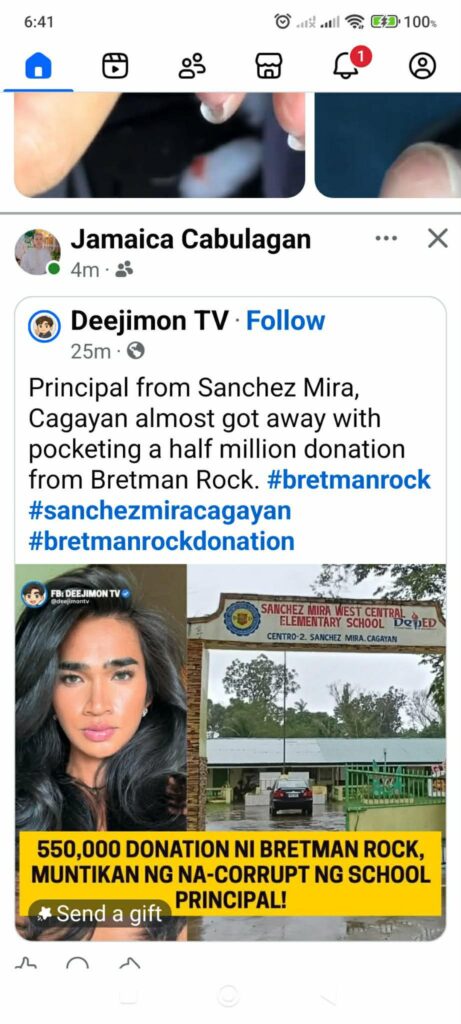 Ang post na binabanggit ay tumutukoy sa FB update ni Deejimon TV na nagsasabing, “Principal from Sanchez Mira, almost got away with pocketing a half a million donation from Bretman Rock.”